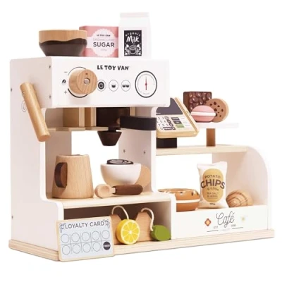 Realistic Coffee Shop Playset – Includes a bean-to-cup coffee machine with milk frother, removable filter, and reversible coffee pods for a lifelike café experience. Interactive Features Galore – Comes with a food display area, cake stand, chalkboard tablet-style till, and a fun stamp-style loyalty card for engaging role play. 17 Café-Themed Accessories – Complete with cups, spoons, pastries, and more, giving kids everything they need to run their own mini coffee shop. Encourages Creative Storytelling – Inspires imaginative play, social interaction, and language development through café role play. Eco-Friendly & Safe – Made from FSC certified sustainable wood with non-toxic materials—plastic-free fun that’s built to last., Manufacturer: Le Toy Van