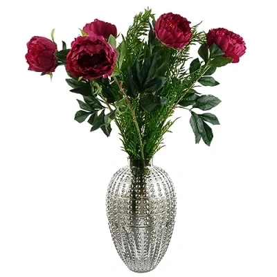 These artificial flower arrangements come with the vases a complete pack of everything you need to create the display shown in our photos. When arranged as we have it shown in our photos this measures 80cm x 50cm x 50cm. Stems are wired and this can be shaped to your requirements This pack contains the following: 1 x LEAF-40575 35cm smoke grey bubble vase 35cm x 22cm x 22cm at widest points. The narrower top rim measures 8cm diameter. 6 x LEAF-40664 80cm artificial dark pink peony stem. 2 x LEAF-40698 120cm artificial Boston fern stem. . High quality product by Leaf Design UK. Flowers and foliage are supplied loose at full length ready for you arrange. You can cut these shorter if wanted for arrangement (very easy- just use wire cutters) or you can just fold the stems at the ends before putting them in the vase. . We also supply all these components separately if you want to add to your arrangement.