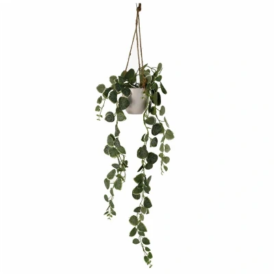 General description Artificial replica of a Ceropegia woodii or String of Hearts plant. Comes potted in a white plastic decorative hanging pot with jute string attachments (30cm long), ready to display. Leaves are silk and stems are plastic. Technical specifications Overall dimensions including hanging strings: 90cm tall x 20cm x 20cm. Small plastic pot dimensions: 10cm (w) x 9cm (h). Other information This product is designed for indoor use only.