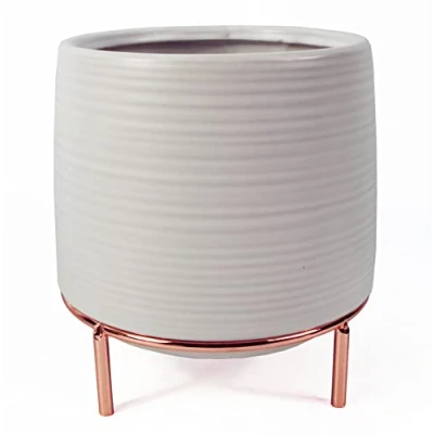 Part of our range of ceramic planters. Measures 17 (d) x 17 (w) x 18cm (h) including metal stand. Overall this is 18cm high including the stand. Inner hole diameter is 13.5cm so any of our plants with pots less than this will fit inside. This has no drainage hole so is also suitable for real plants. Metal stand height is 5cm. Pot Measurements 17cm x 17cm x 18cm. Inner hole diameter is 13.5cm Ceramic. Designed for indoor use. Can be used for real or artificial plants. High quality product from Leaf Design UK.