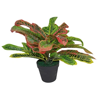Leaf Design Tropical Artificial Plants - 40cm Croton Overall size as arranged in our photos: 40cm tall. Comes fully assembled requiring only minor arrangement to suit your space. Comes in a Plastic weighted pot. Pot Measurements: 12.5cm (d) x 11cm (h) approx. Stems are wired and can be shaped to your requirements. High quality plant from Leaf Design UK.