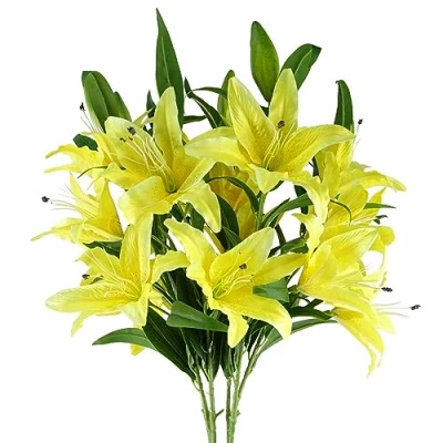 Pack of 6 x Yellow lily artificial flower stems Can be used to make arrangements with our other artificial flowers or as decorations on their own Each stem measures 100cm overall height x 22cm wide x 22 deep and has 3 flowers and a bud Flowers are silk. The stems are wired so these can be shaped and bent to arrange. These are easy to cut down shorter using a pair of wire cutters if required Some of our photos show vases to give an idea of size and possibilities for arrangement but no vases or planters are included with these flowers