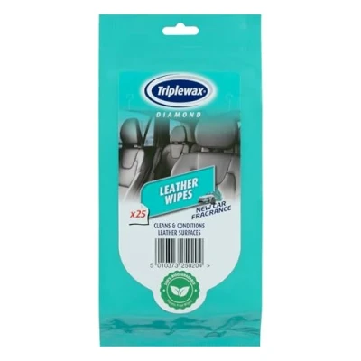 AmazonCLEAN AND CONDITION: Triplewax Diamond Leather Wipes effectively clean and condition leather surfaces, removing dirt, grease, and grime effortlessly. PROTECT AND PRESERVE: These wipes enhance the appearance of leather while preventing cracking, fading, and premature aging, keeping your leather looking its best. ECO-FRIENDLY: Made from 100% biodegradable materials and entirely plastic-free, these wipes are an environmentally responsible choice for leather care. NEW CAR FRAGRANCE: Enjoy a pleasant new car scent after each use, leaving your leather surfaces smelling fresh and clean. CONVENIENT AND EASY TO USE: Pre-moistened and ready to use, these wipes provide a hassle-free solution for maintaining leather surfaces, perfect for on-the-go cleaning.