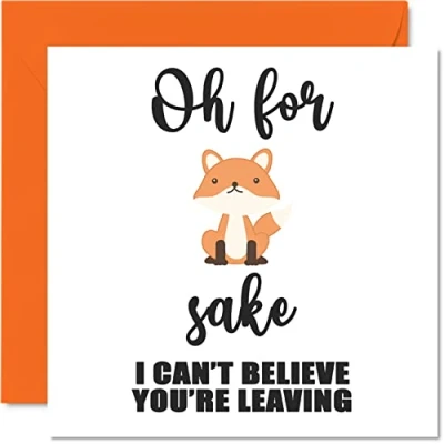MAKE THEM LAUGH WITH THIS FUNNY LEAVING CARD: This exceptional quality good luck gifts card for her or him shows the design "Oh For Fox Sake I Cant Believe You're Leaving". If you are looking for funny leaving cards for women, then then this leaving cards for colleagues is bound to make them laugh. Not just for sorry your leaving cards for women this could also be for Work Colleague, Best Friend, Boss, or Manager. WHAT DO YOU GET: The card is printed on one side and BLANK ON THE INSIDE to allow you to write your very own message. The unique fun design is printed on a specially sourced and environmentally responsible board. At 360 microns thick the natural white one-sided gloss board has a quality look and feel. Supplied with a coloured gummed envelope to complement the design and ready to be sealed and sent in the post. New job gifts, sorry your leaving gifts, graduation card. NO INK SMUDGES: There is nothing worse than writing inside a card to find that the shiny surface makes the ink smudge. This is why we use a high quality one sided coated board. The uncoated side will absorb more of the ink from your pen to make smudging a thing of the past. Leaving presents for colleagues, new job gifts for women, good luck cards. SIZES: Greeting Card = 145mm x 145mm, Envelope = 155mm x 155mm, Card Thickness = 360 micron. Great friend leaving cards from bestfriend. Special friend leaving cards for her, congratulations on your new job, leaving gifts for men, new job card for women, sorry youre leaving card, leaving present ideas, new job cards for men. MADE AND QUALITY CHECKED IN THE UK: We print and manufacture all our product right her in the UK so you can be sure of a fast turnaround and a product that is expertly made. Using environmentally responsible premium board our card is conscious of the responsible management of the world's forests - good luck in your new job gifts, goodbye cards, funny leaving gifts for colleagues.