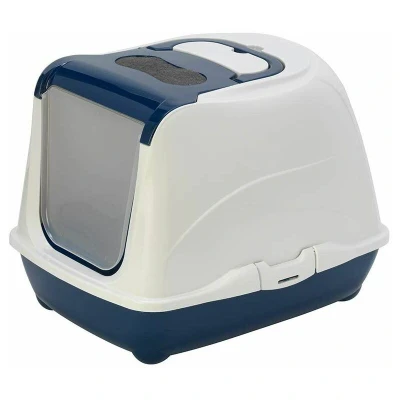 General description The Hooded Cat Loo Blue Berry is designed for your feline's comfort and privacy. With a hinged door for easy access, your cat can enter quickly when needed. The spacious interior ensures your pet has ample room, while the foldable top cover includes an active charcoal filter to effectively trap unpleasant odors. This litter box is not only convenient for your cat but also simplifies cleaning for you. Technical specifications Dimensions: 50 cm Material: BPA-free, non-toxic, and 100% recyclable premium plastic Usage Easy to clean with warm soapy water Integrated handle for convenient movement Hideaway spot for the scoop in the ceiling Two clever clip-locks to keep the box secure Translucent door for added privacy