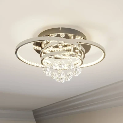 The Keely ceiling light features two shiny chrome circles that form the base of its unique design. The warm white LEDs are discreetly concealed beneath a crystal-like cover, which gives the light a sparkling appearance. This visual effect is further enhanced by an elegant crystal hanging, strategically placed at the intersection of the two circles. The thoughtful design makes it a stunning addition to a variety of interiors, whether they lean towards modern or classic styles.