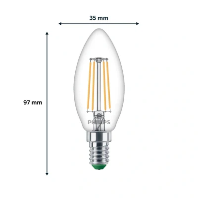 LED candle bulb E14 2.3W filament 2,700K in a pack of 3 This ultra-efficient LED bulb from Philips in a candle shape with a filament look creates a beautiful light atmosphere, offers an exceptionally long service life and enables significant energy savings thanks to its excellent energy efficiency class. The candle bulb comes in a convenient pack of 3, perfect for replacing several traditional light bulbs with modern LED bulbs. The bulb meets the EyeComfort criteria developed by Philips and provides a pleasant, eye-friendly light.