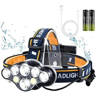 2025 SUPER BRIGHT 10 LED & LONG LASTING HEAD TORCH - 2025 Upgraded High quality battery supports 3 hours fast charge which provides for 7-8 hours using time. Due to its advanced T6*4 + XPE*4+SMD*8 LED bulbs design, the battery life of a full charge in each usage is three times longer and brighter than normal head torches in market.2025 SUPER BRIGHT 10 LED & LONG LASTING HEAD TORCH - 2025 Upgraded High quality battery supports 3 hours fast charge which provides for 7-8 hours using time. Due to its advanced T6*4 + XPE*4+SMD*8 LED bulbs design, the battery life of a full charge in each usage is three times longer and brighter than normal head torches in market. Rechargeable & Comfortable Fit: With 2*18650 rechargeable batteries and a USB cable. The head torch is lightweight, weighing only 90g, and the elastic, anti-slip headband ensures a comfortable fit for both children and adults. The adjustable headband system of the headlamp guarantees maximum comfort and balanced weight distribution between the front and back of your head, making it an ideal gift for men and women. HIGH QUALITY AND WATERPROOF: Waterproof headlamp is durable and sustainable. It adopts a fully enclosed design to prevent water mist and rain from entering, this headlamp is protected from splashing water from any direction and will be able to withstand harsh weather conditions, including heavy rain and snow. 8 LIGHTING MODES , UPDATED BATTERY INDICATOR: This led rechargeable Head Torch is prepared to adjust to a full range of lighting needs.the main light can select high, low, all or SOS strobe 8 modes. Auxiliary light mode, and you can choose high, low, red light, and SOS strobe.It comes with a TYPE-C line to provide a stronger bright and longer life.Battery Indicator,When The Regular Mode Button Turns From Green To Red, It Means The Power Is Low And Needs To Be Charged. Multifunctional: The adjustable headband can be worn directly on the head or attached to a helmet, perfect hands-free headlight for jogging, cycling, camping, hiking, car repairing, night fishing, night reading, dog walking, DIY works and other long night activities, no more stumbling around in the dark.