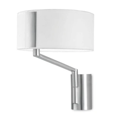 The wall lamp has a modern design that will add the perfect touch to your room. The steel fitting has a satin nickel finish and supports an acrylic diffuser with a white cotton, drum shaped shade. The lamps' head can be twisted from side to side as desired. There are other matching lamps available in this design.