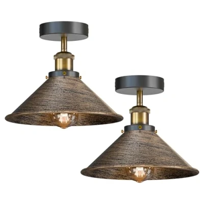 π©ππ‘π§πππ πππ¨π¦π π π’π¨π‘π§ πππ¦πππ‘:This elegant flush light fitting adds a industrial charm to any space. The cone-shaped metal shade and antique finish bring a timeless vintage look. πππππππ ππππππ: Crafted with quality metal and a spray painted finish, this ceiling lighting gives a stunning look and built to last, making it a statement piece in any room. ππππ ππππ Uses an E27 bulb base, compatible with various LED bulbs. You can adjust brightness easily by using different bulb wattages to suit your room's ambiance. ππππ ππππππππππππ: Easy to install with standard mounting hardware included wihtout any hazzle. Compatible with E27 base bulbs (bulbs are included). Ideal for ceiling wiring setups in residential or commercial environments. ππππππππππ: Industrial Ceiling Lights with a 10cm height, 22cm shade width, and 10cm ceiling rose, perfect for smaller to medium spaces. ππππππππ Perfect for living rooms, bedrooms, kitchens, cafΓ©s, hotels, offices, bars, and showrooms. This ceiling light complements all dΓ©cor styles with an industrial modern flair.