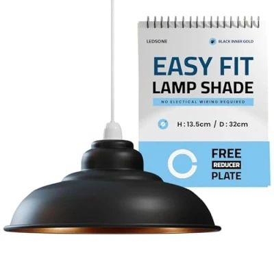 LEDSONE Industrial Lampshade Metal Black Inner Gold 32cm Easy Fit with Reducer Plate Modern Hanging Pendant Light Shade for Bedroom, Hallway, Office, Kitchen, Dining Room, Cafe, Bar, Restaurtant