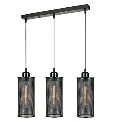 Design: Features a sleek cylindrical metal shade with a modern industrial look.The open cage design allows for optimal light distribution. Minimalistic black finish complements a variety of décor styles. Material: Crafted from durable, metal with a fine mesh pattern. Black powder-coated finish enhances resistance to wear and adds a refined touch.Sturdy suspension cord ensures durability and safety. Dimension: This pendant light includes a 10cm width, 24cm height lampshade, an adjustable 95cm cable, and 50cm square ceiling rose, offering versatility for various ceiling heights Easy to Install: Includes all essential mounting accessories and clear instructions, ensuring a quick and hassle-free setup for any ceiling type, saving time and effort. Applicable Areas: Perfect for kitchens, dining areas,kitchen island, cafes, restaurants living rooms, hallways, or entryways or other modern industrial-themed spaces to create a cozy ambiance. Package Included: Our Package includes 1x 50cm Black Metal Ceiling Rose Square 3 Outlet, 3 X Pendant Lamp Base , 3 X Light Holder with 95cm Adjustable Cable and 3x Barrel Cages. 3x Bulbs