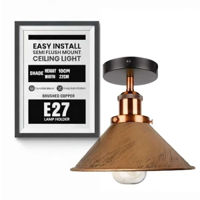 Vintage Industrial Design: Featuring a brushed copper conical metal shade, yellow brass neck, and ceiling canopy, this flush ceiling light adds a warm vintage-industrial character that complements both modern and classic interiors. Durable Metal Construction: Crafted from quality brass-plated metal with a polished finish, this ceiling light is strong, rust-resistant, and designed for long-lasting everyday use. Compact & Space-Saving Size: Lampshade diameter 22 cm, shade height 10 cm, lamp holder height 9 cm, and ceiling rose diameter 10 cm—ideal for small to medium rooms and low ceilings. Easy to Install: Supplied with fixing accessories and installation guide. It supports standard E27 base bulb, gives a simple and hassel free setup. Wide Indoor Use: Suitable as an industrial kitchen ceiling light, hallway ceiling lamp, bedroom ceiling fixture, or indoor lighting for cafés, offices, and restaurants. Package Included: 1x Ceiling Rose with Assmeble Parts (Bulb is not included), 1x Lamp Holder, 1x Shade Ring, 1x Lamp Holder