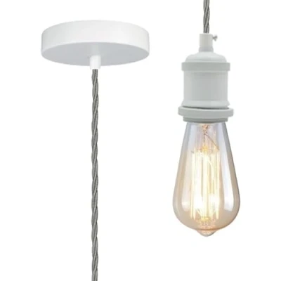 LEDSone White Vintage Metal Ceiling Pendant Light Fitting, Grey Twisted Braided Flex 1m Cable, E27 Lamp Holder Suspended Fitting Kit for Indoor Lightings