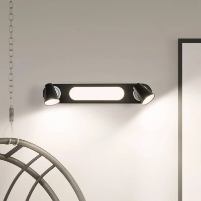 Neptune LED ceiling light with two spots and light source in the canopy The Neptune LED ceiling light made of steel is equipped with three light sources - warm white LEDs have been installed in the two adjustable spots and in the canopy. The light sources can be switched on separately or together using the wall light switch. This 3-stage switch (Click Select) makes it possible to switch on the ambient lighting, the two spots or both together - Adjustable spotlights - Mounting and connection accessories included