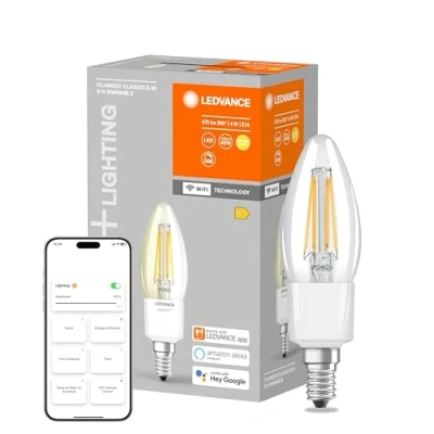 LEDVANCE Smart LED bulb with Wifi technology, E14, Dimmable, Warm white (2700K), Candle shape, Clear filament, Replacement for conventional 40W bulbs, Controllable Alexa, Google & App, 1 pack
