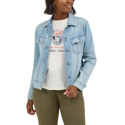 REGULAR FIT. This timeless denim jacket comes in a regular fit and hits just below the natural waist for a relaxed look. Stretch denim fabric moves with you for comfort. STRETCH FABRIC. Made with a stretch cotton blend, this denim jacket has just enough flexibility to let you move without restriction. EVERYDAY CLASSIC. This jacket features iconic details with dual Lee button-flap pockets and two front side pockets. Lee buttons and a small Lee patch add a signature look. A LIFETIME OF QUALITY. For over 100 years, Lee has produced quality apparel with durability and long-lasting construction in mind. Lee is committed to designing clothing that conforms to your body, allowing you to move through life freely. SPECIFICATIONS. Button-front closure, center back length: 16.5", sleeve length: 31.375", sweep: 39.25", product measurements were taken using size 10 petite. Please note that measurements may vary by size.