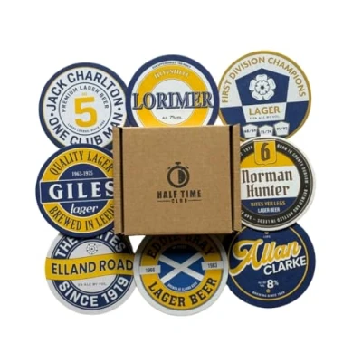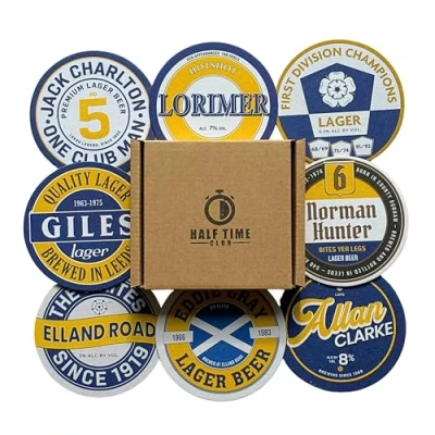 BUNDLE OF 8 - A must-have for any Leeds United fan! Get 8 Leeds beer mats - perfect for displaying your support for the team at any party or gathering. Show your allegiance with the Peacocks with these LUFC themed beer mats. PERFECT PRESENT - Surprise your favourite Leeds fan with these Beer Mat Coasters! A unique and thoughtful gift they'll love. Making a great stocking filler. GIFT PACKAGED – Arriving in a premium gift box ensuring your beer mats come in perfect condition, hassle-free. PREMIUM PULPBOARD - This beer mat set is made of a durable, high-quality, thick, absorbent pulpboard that'll make any footy fan proud. Perfect for keeping your drinks and tables safe. UNIQUE DESIGNS - Indulge in a relaxed and nostalgic vibe as you enjoy your favourite drink, surrounded by the iconic players, club songs, and historic moments that define the team's legacy.