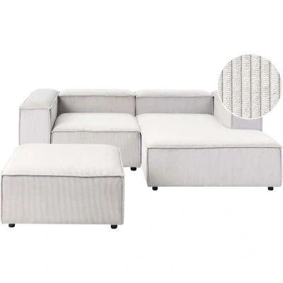 Jumbo Cord Modular Sofa with Footstool. Refresh the look of your living room with this modern sectional sofa with an ottoman. Upholstered in corduroy with a soft ribbed texture, it brings comfort and character to both modern and traditional living rooms. Additionally, the piece is supported by synthetic material legs and sturdy wooden construction that provides stability. The sofa consists of two modular sections and an ottoman, which can be arranged together or separately to create various configurations perfect for your needs. Details: Product Type: Modular Sofa General Color: White, Black Shade: Off-White Material Type: Fabric Main Material: Corduroy Additional Material: Synthetic Material Filling Material: Foam Material Composition: 100% Polyester Shape: L-Shaped Arm Style: Track Fabric Upholstered Back: Yes Leg Caps/ Pads: No Orientation: Left Hand Pattern: Solid Seat Construction: Elastic Belt Seats Up To: 2 People Dimensions: Armrests Height: 68 cm Depth: 180 cm Ottoman