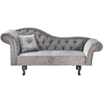 Classic Chaise Lounge with a Decorative Cushion. This classic chaise lounge is the perfect finishing touch for modern and traditional interiors. It is upholstered in high-quality velvet fabric. The material is elegant, scratch resistant and prevents pet hair from getting into the fabric, making the chaise lounge ideal for homes with dogs or cats. The piece has rolled arms on both sides and a smooth-lined back for total comfort and timeless style. Precise button tufting adorns the upholstery, and curved solid wood legs complete the elegant look. Details: Product Type: Chaise Lounge General Color: Grey, Brown Material Type: Fabric Main Material: Velvet Additional Material: Rubberwood Filling Material: Foam Material Composition: 100% Polyester Arm Style: Recessed Orientation: Left Hand Pattern: Solid Reclining: No Seat Construction: Sinuous Springs Seat Foam Density: 30 kg/m3 Dimensions: Armrests Height: 81 cm Depth: 59 cm Seat Thickness: 19 cm Seat Height: 39 cm Width: 192 cm Height: 81