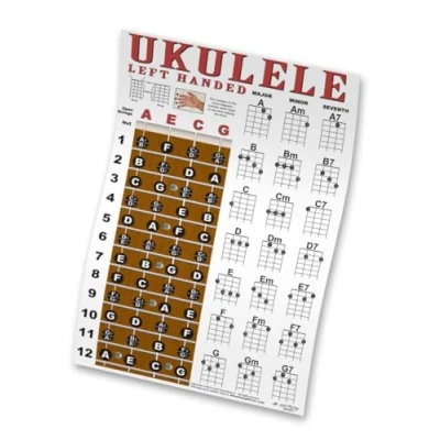 Great learning tool for beginning & intermediate LEFT HANDED ukulele players. Nice to hang on the wall wherever you practice for easy reference and easily inserted into your practice notebook. This chart includes the notes of the ukulele displayed on the fretboard and a chord chart. This information can be found in books, but rarely on one easy to read chart! Tuning is gCEA for soprano, concert and tenor ukes. NOTEBOOK NOT INCLUDED - NOT HOLE PUNCHED 11" x 17" Instructional Guide Heavy 80lb Glossy Paper Major, Minor, & 7th Chords for basic Left Handed Ukulele Chords Note locations on the fretboard - Great reference to help you memorize the notes.Clear and crisp print that's easy to read._xD83C__xDDFA__xD83C__xDDF8_ Made in the USA
