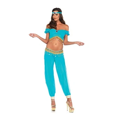 3 piece Desert Beauty costume set Includes coin trimmed off the shoulder crop top with three row hook and eye closure Harem pants with zipper back Elastic cuffs and jewelled head piece Material: 100% polyamide / nylon