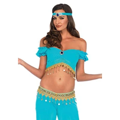 Amazon 3 piece Desert Beauty costume set Includes coin trimmed off the shoulder crop top with three row hook and eye closure Harem pants with zipper back Elastic cuffs and jewelled head piece Material: 100% polyamide / nylon
