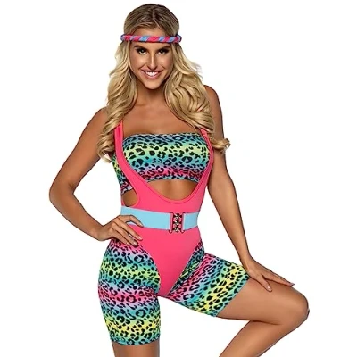 Grab your boom box and show off your buns of steel in the bold Leg Avenue 4 Piece 80s Cardio Cutie Costume Set The cheeky 1980s costume features a suspender romper with attached bike shorts, bandeau, belt, and headband Show off your show-stopping curves with the sexy suspender rompers with attached bike shorts and curve-hugging bandeau top Wrap up the adorable aerobics babe look with the matching wrapped headband and elastic waist belt X-Small fits size 0-2, Small fits size 4-6, Medium fits size 8-10, and Large fits size 12-14 To care, hand wash in cold water and drip dry, do not bleach or heat dry For cool groups or couples costumes, check out the Leg Avenue collection of 1980s era costumes Great for Halloween or theme parties, Manufacturer: Leg Avenue