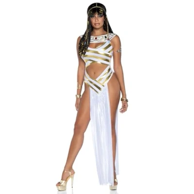 Embody legendary beauty for the night in the sexy Leg Avenue 3 Piece Nile Queen Costume Set complete with gold striped cut out dress with jeweled collar and flowing pleated panel skirt, and matching headpiece Show off those commanding curves with the golden striped dress with ornate jeweled collar, pleated panel satin skirt, and provocative cut out accents The glittering jewel collar design and matching draped beaded headpiece add a ravishing royal touch to this sexy Egyptian goddess costume Small fits size 4-6, Medium fits size 8-10, and Large fits size 12-14.To care, hand wash in cold water and drip dry, do not bleach or heat dry For ancient Egyptian inspired couple or group costumes, check out the Leg Avenue collection of Egyptian costumes for men and women. Great for Halloween or theme parties, Manufacturer: Leg Avenue