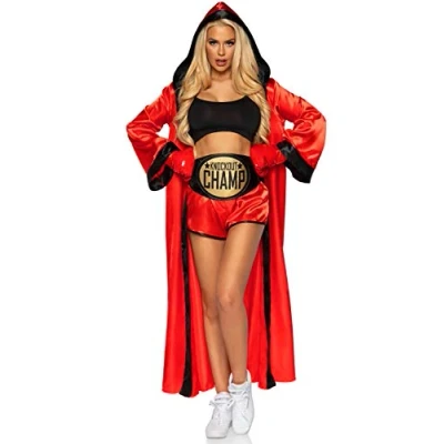 PACKAGE INCLUDES: top, shorts, robe, belt, gloves. FIT & STYLE: Stretchy crop top and comfortable elastic waist satin shorts pair together for a prize winning look. MATERIALS/ CARE: Hand wash cold, Do not bleach, Drip dry, Do not iron OCCASION: This Knockout Champ boxer costume for women is perfect for themed parties, cosplay, Halloween, or ring side bouts. FEATURES: Fun champion belt for a winning look., Manufacturer: Leg Avenue