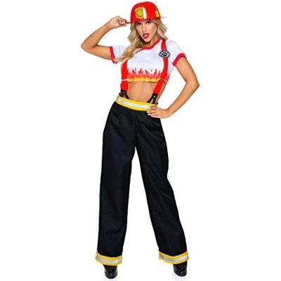 2 pieces. Fireman women's crop-top with flames, trousers with reflective tape, braces. Size: L (UK 14-16) Fantastic fit, high wearing comfort. Hand wash only and hang to dry. Do not bleach. 100% polyester., Manufacturer: Leg Avenue Inc.