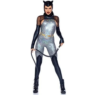 Leg Avenue 86996-06503 4 Pc Feline Felon, Includes Holographic Catsuit With Boot Detail, Fishnet Gloved Shrug, Cat Ear Skull Cap, And Belt, Large, Blk/Silver Body: 100% Polyester .Leg Warmers: 93% Polyester 7% Spandex .Mesh: 100% Polyester .Sleeves: 93% Polyester 7% Spandex . Large Blk/Silver, Manufacturer: Leg Avenue Inc.