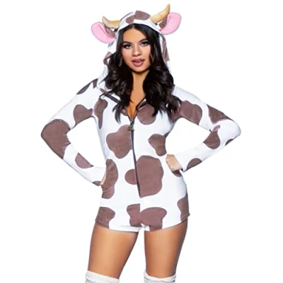 Cow costume consists of an ultra-soft velour zip romper with a cow's bell pull, hood with horns and ears and tail. Theme: Catching animals, Manufacturer: Leg Avenue Inc.
