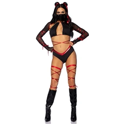 Leg Avenue 87104-01101 5 Pc Lethal Ninja, Includes Strappy Wrap-Around Bra Top With Attached Mesh Gloved Shrug, V-Cut Bottoms, Leg Wraps, Face Mask, And Matching Hair Ties, Small, Black/Red Body: 91% Polyester 9% Spandex .Bottom: 91% Polyester 9% Spandex .Sleeves: 96% Nylon 4% Spandex . Small Black/Red, Manufacturer: Leg Avenue