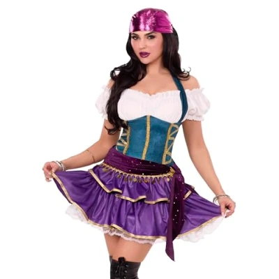 Off-the-shoulder peasant top with lace trim Teal corset bodice with gold ribbon Flouncy skirt with shimmering accents Includes metallic magenta headscarf, Manufacturer: Leg Avenue