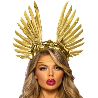 Channel divine elegance with Leg Avenue's Goddess Headband. Featuring lustrous golden flowers complemented by striking feathers that fan out dramatically. Whether paired with a warrior outfit or a unique DIY Halloween ensemble, this accessory ensures a breathtaking and celestial presence at any event., Manufacturer: Leg Avenue Inc.