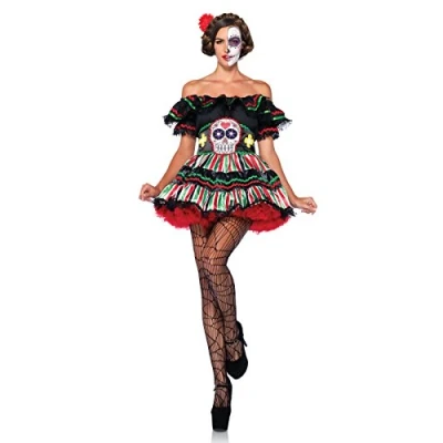 Off the shoulder peasant dress Complete with a day of the dead print Bric brac trim accents Wide sugar skull belt Perfect for a fancy dress party and Halloween, Manufacturer: Leg Avenue