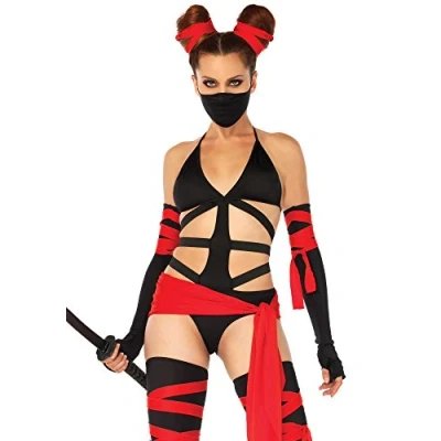 6 piece Killer Ninja costume set Includes strappy bikini bodysuit and matching wrap around thigh highs Wrap around arm warmers, waist sash, hair wraps and face mask Versatile separate bodysuit also wearable as fashion Material: 100% polyester, Manufacturer: Leg Avenue Inc.