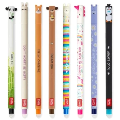 Everyone gets wrong sooner or later. Not everyone has a whole team of friends ready to correct their mistakes! Write, erase and scribble as often as you want, thanks to the heat-sensitive ink you don't have to throw away the paper, and the trees thank you! FEATURES: The ball placed at the end of the pen does not wear like normal erasers, does not damage the affected surface and erases perfectly. Smooth writing. DIMENSIONS: With a 0.7mm tip diameter, this cute pen is perfect for all types of uses, in school, office and leisure. The pen has a diameter of 0.8 cm, height 15 cm. GIFT IDEA: What better way to express affection for someone than with an erasable pen Legami? Thanks to their cute designs, these erasable pens are a gift that adds colour to the greyest days! Set of 8 erasable gel pens with the following designs & ink colours: Panda (black ink), Bunny (purple ink), Corgi (black ink), Teddy Bear (red ink), Llama (blue ink), Unicorn (pink ink), Hippo (blue ink), & Penguin (turquoise ink).