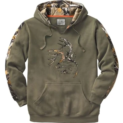CAMO DETAILS: Select from our exclusive Big Game Camo, Mossy Oak Break-Up Country, Mossy Oak Bottomland or Mossy Oak Elements Terra Coyote EASY ON/OFF: Pre-ripped V-neck for extra comfort in a pullover BRANDING: Legendary Signature Buck cut out logo with camo or solid color inset PREVENT CHILL: 3 panel hood with flat drawstring keeps the wind out while the kangaroo pocket provides hand warmth International products have separate terms, are sold from abroad and may differ from local products, including fit, age ratings, and language of product, labeling or instructions.