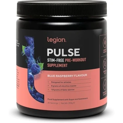 Legion Pulse Pre Workout Supplement All Natural Nitric Oxide Preworkout Drink to Boost Energy, Creatine Free, Naturally Sweetened, Beta Alanine, Citrulline, (Caffeine Free Blue Razz)