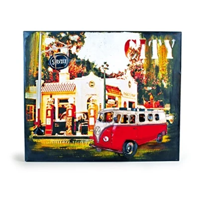 This amazing metal painting captivates with the nice background and the striking 3D appliques It seems the bus is driving through the picture A pretty wall decoration for your home Metal Sign Hippie Bus "Vintage Design" For children from 3 years, Manufacturer: Legler