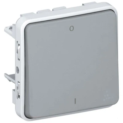IP55 10AX 250V Bipolar Plexo Switch with Grey Trim to be fitted with a protruding box or mounting plate for flush mounting - Bipolar Plexo Switch - Grey - IP55 - IK07 - 10AX - 250V - Automatic terminal connection - Mechanism delivered with hubcap - To be equipped with a plate support for recessed mounting in the box or a housing for surface mounting