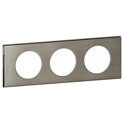 The Céliane finishing plate - 3 positions - color: Brushed Stainless Steel is the final element to clip onto a socket to complete the set. This plate can be installed horizontally or vertically and can be combined with ref: 080253.