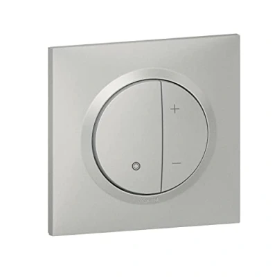 Aluminium. It replaces a single switch and offers advanced functions: sleep mode, last level memory (3 possible levels) Mechanism comes with claws for easy installation in renovation Built-in memory level: the light turns on at the level of illumination set before the last extinction Can be combined with one or more non-luminous pushers, each push allows for on/off and variation functions, Manufacturer: legrand