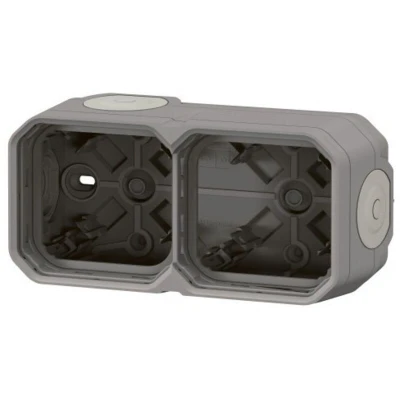 General description IP55 Plexo waterproof 2-gang box for surface mounting of all Plexo functions horizontally or vertically, equipped with 4 flexible membrane end caps in a gray finish. Designed for the installation of products delivered in modular mode. Technical specifications Protection rating: IP55 (protected against dust and water jets from all directions). Material: Plastic with reinforced UV protection.