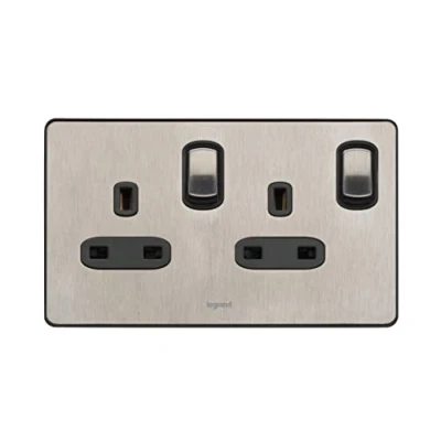 Legrand Synergy Sleek Design 832070 switched double pole socket outlet, 2 gang, 13 A, 250 V AC, brushed stainless steel