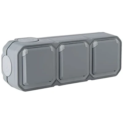 Legrand Triple Socket with Waterproof Grounding Pre wired Perspex Flap 16A 250V Complete for Horizontal Mounting in Grey Surface Mount