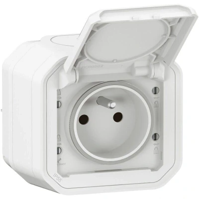 General description IP55 waterproof ground socket with Plexo 16A 250V damper, delivered complete with housing and ready to be installed on the wall. This product features a white finish and is designed for surface installation, providing protection against dust and water splashes from all directions. Technical specifications Power outlet type: 2P+T Current rating: 16A Voltage rating: 250V Protection rating: IP55 Shock resistance: IK08 (5 joules) Connection type: Quick connection without tools with color marking