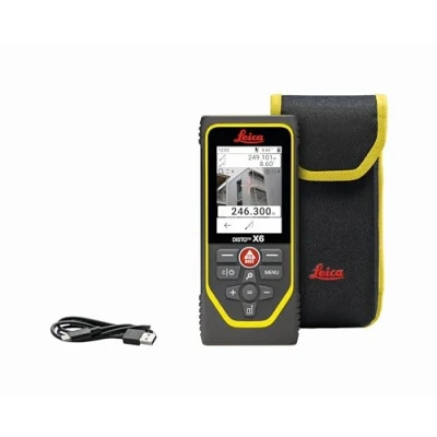 The Leica X6 laser rangefinder is ideal for demanding job sites. With an accuracy of 1 mm and a range of 250 m, it is sturdy and compliant with IP65 standards, resistant to dust and splashes. Tested for drops of up to 2 meters, it ensures reliability and durability.